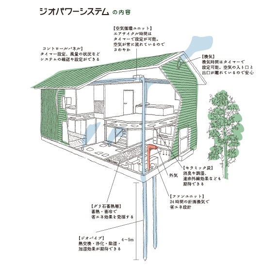 地中熱利用換気システム「ジオパワーシステム」は、私たちの最も身近にある「自然の恵み」と現代人の知恵「最新の技術」との融合で実現した、省エネシステムです。四季を受け入れ、自然と共存する暮らしを楽しみ、地球との心地よい環境を築くことで、本当の「快適」を見つめ直して頂ければと思います。